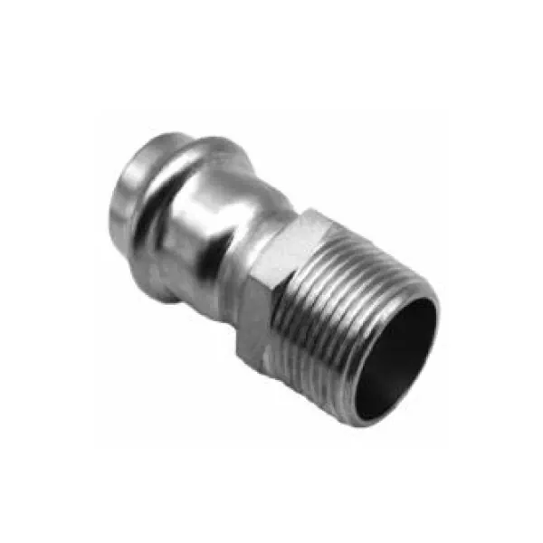 A transition element connecting a press line to a male threaded (R) equipment. One end is press-fit, the other is a male thread.